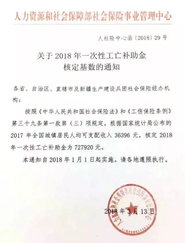 近日,人社部社保中心发出《关于2018年一次性工亡补助金核定基数的通知》,一次性工亡补助金从2017年度的672320元提高至727920元,增加55600元。